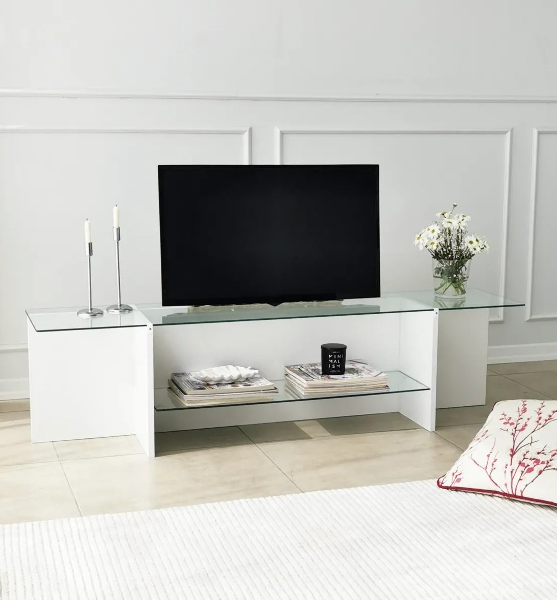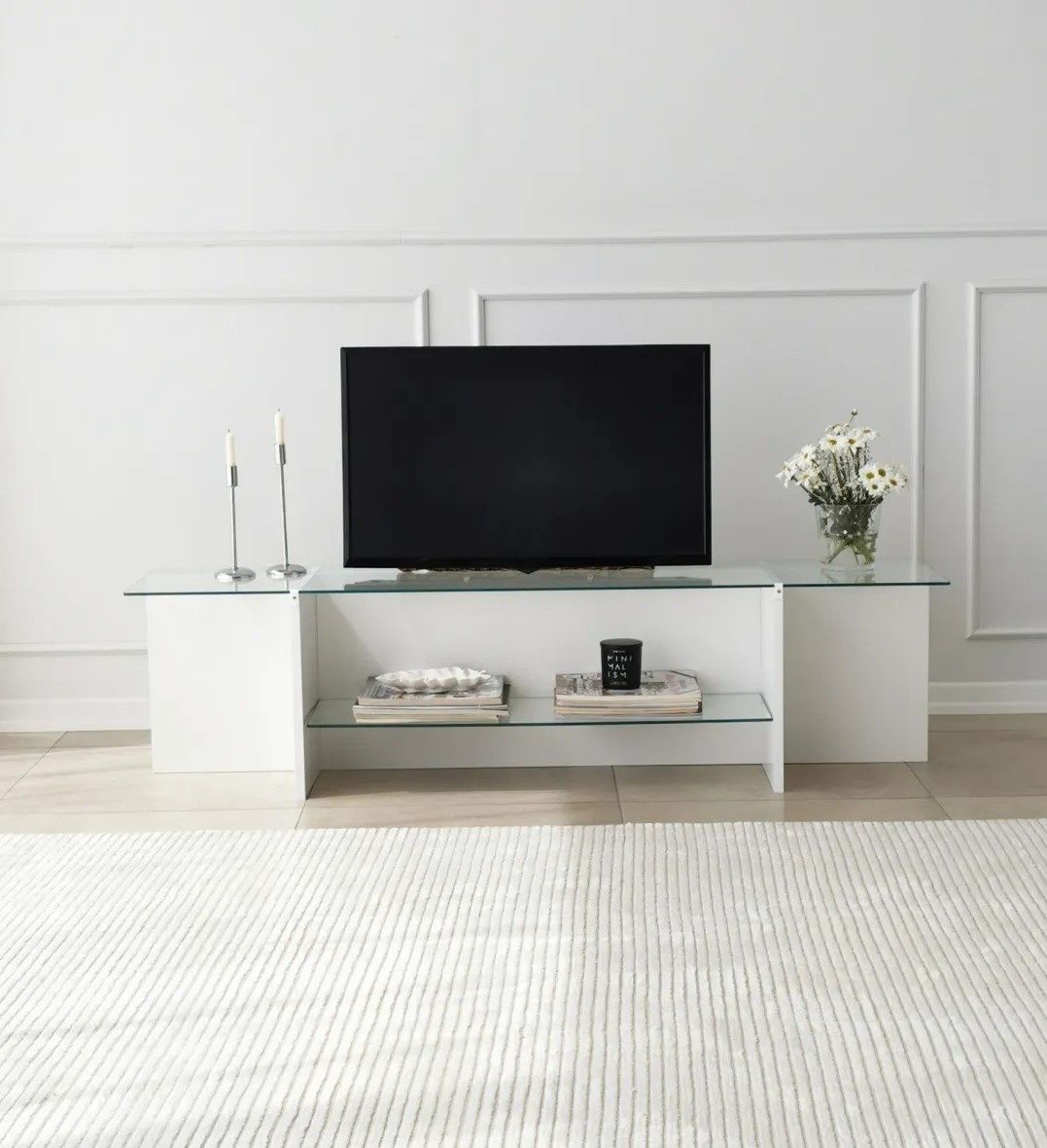 Fabricat din sticlă 100% călită, suportul TV emană un sentiment de eleganță atemporală. Suprafața netedă și solidă asigură durabilitate de lungă durată și oferă un suport sigur pentru televizor și alte dispozitive media.