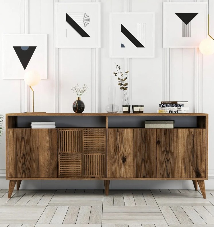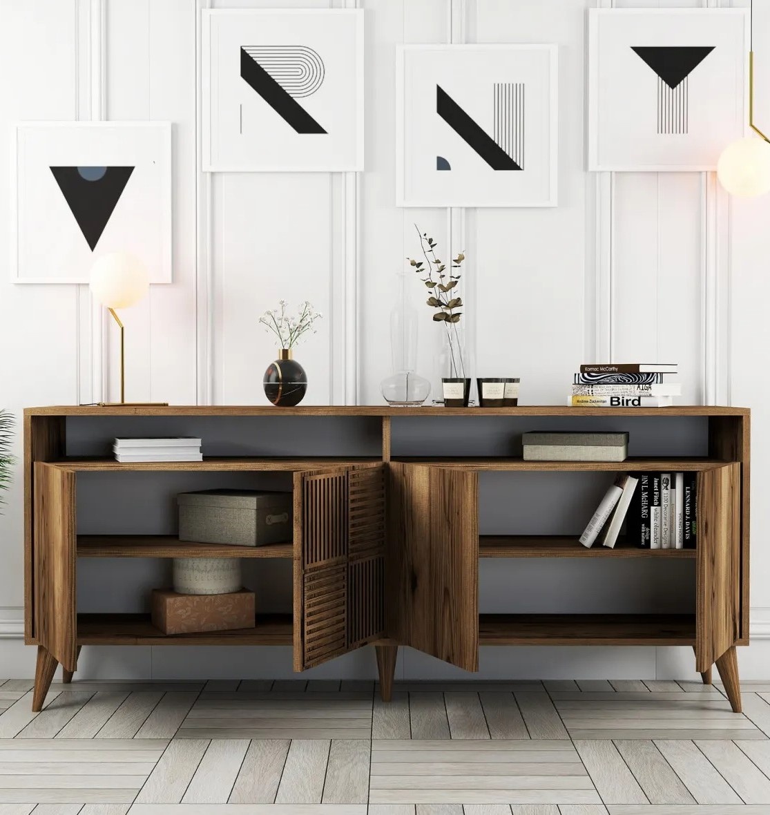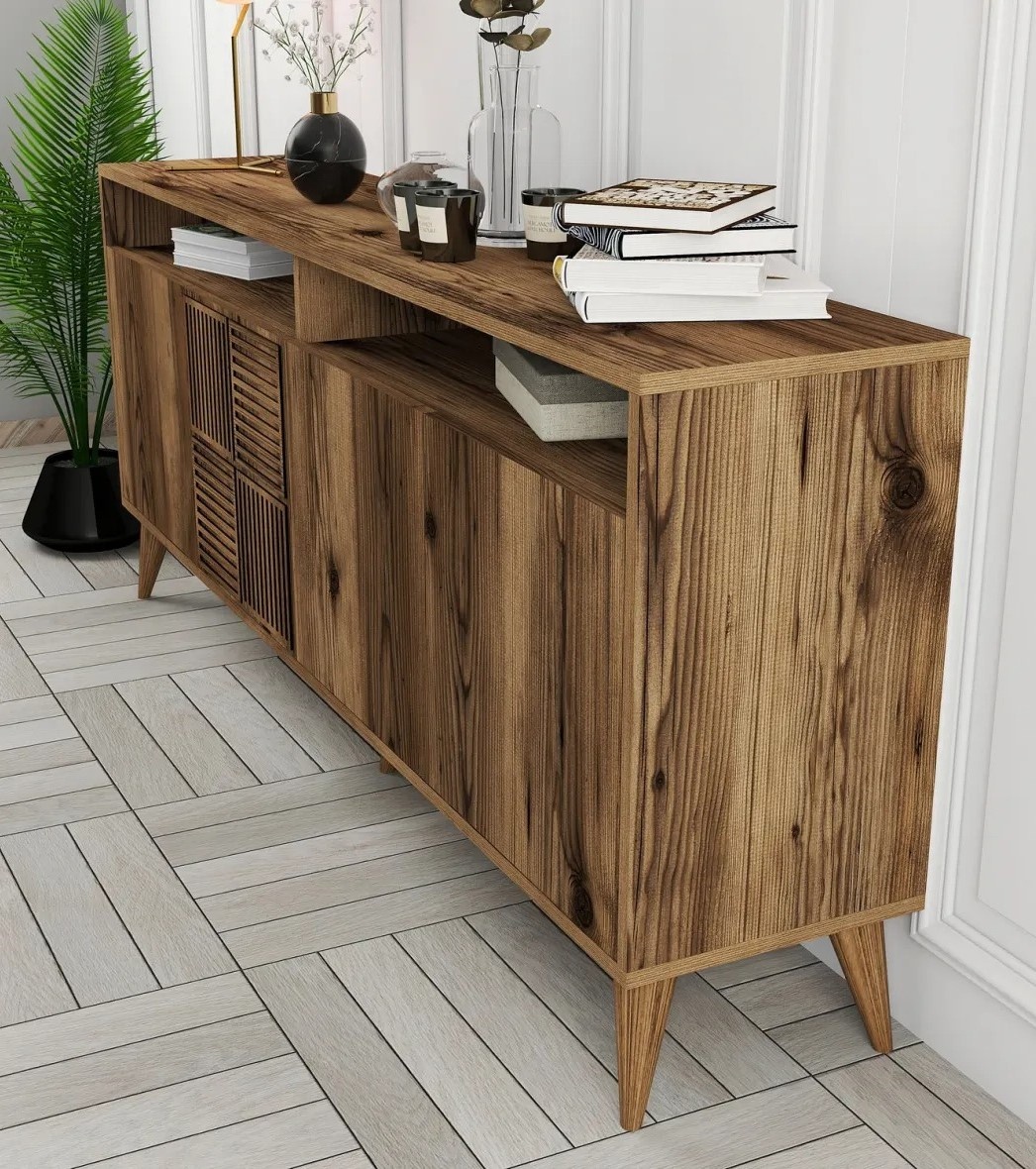 Realizată cu cea mai mare grijă și atenție la detalii, consola noastră este fabricată din panouri de particule acoperite cu melamină 100%, asigurând durabilitate și longevitate. Grosimea de 18 mm adaugă robustețe, ceea ce o face o piesă de mobilier de încredere pentru anii ce vor urma.