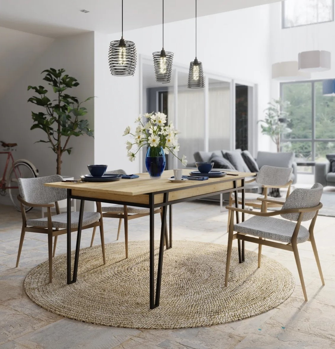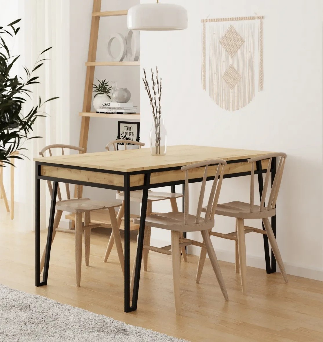 Masa extensibilă combină armonios elemente boeme, industriale și moderne. Designul deosebit completează diferite stiluri de amenajare și oferă un aspect plăcut în orice încăpere. Picioarele metalice oferă stabilitate și rezistență, menținând piesa solidă și fiabilă în timp.