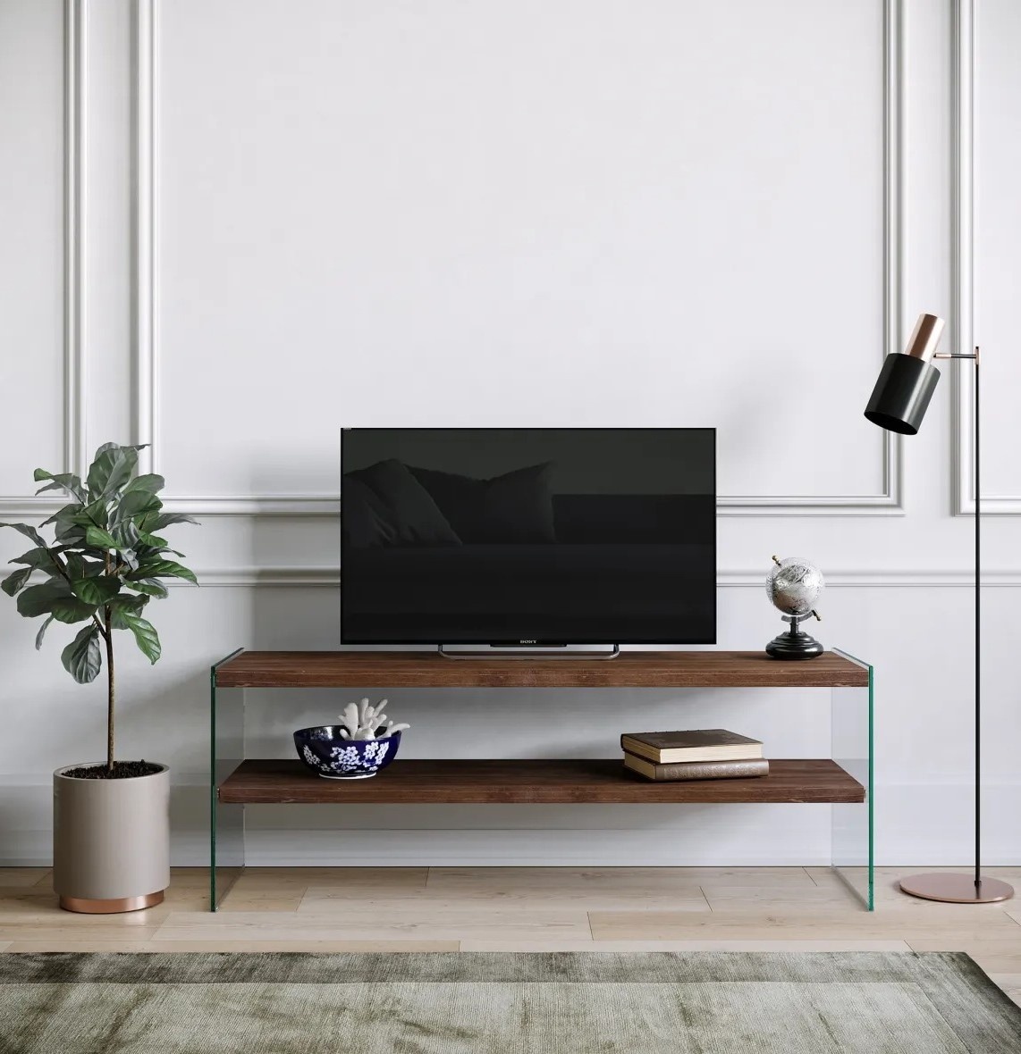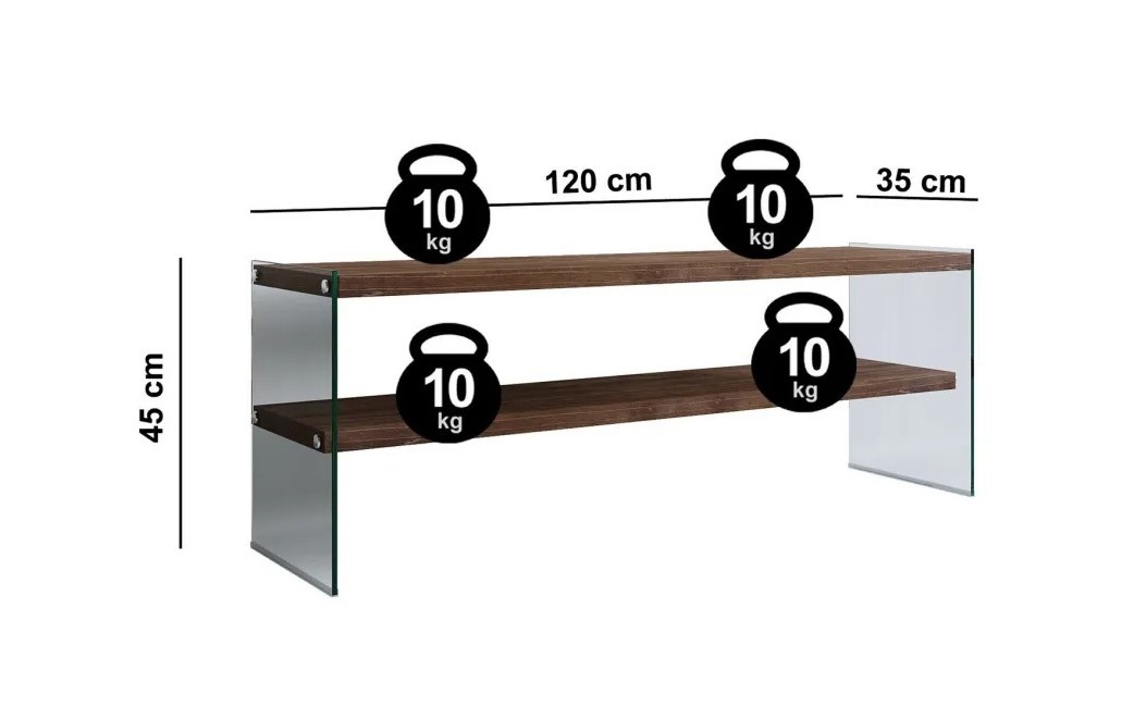 Cu grosimea de 8 mm, suportul este construit pentru durabilitate. Cadrul din sticlă călită garantează stabilitate și siguranță. Fiecare raft suportă până la 20 kg, permițând plasarea televizorului, consolelor de jocuri și altor dispozitive media.