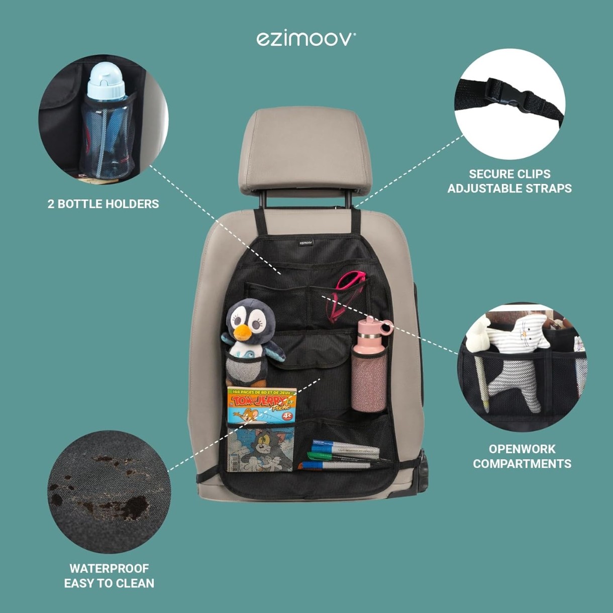 Pastrati spatarul scaunului curat si fara zgarieturi cu Ezimoov Travel Plus. Cu un design practic, Ezimoov Travel Plus protejeaza spatarul scaunului din fata impotriva urmelor produse de incaltamintea celor mici si ofera multiple spatii pentru organizarea lucrurilor din masina.