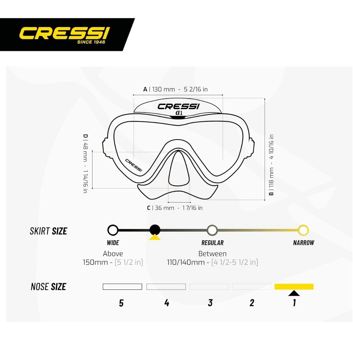 Cressi-Sub A1 Mask este o mască pentru scufundări și freediving. Lentila unică din sticlă securizată are un tratament special care o face complet anti-aburire, fiind foarte practică pentru orice tip de imersiune. Lentila este înclinată și are formă de lacrimă inversată, ceea ce mărește câmpul vizual în jos și permite un control mai bun al echipamentului subacvatic.