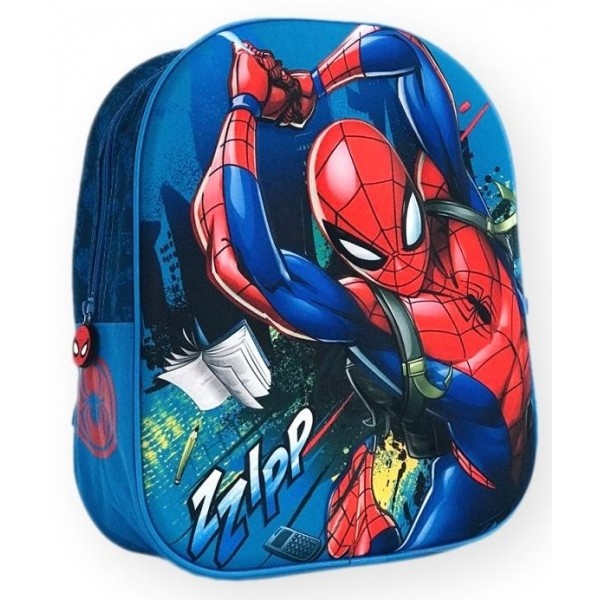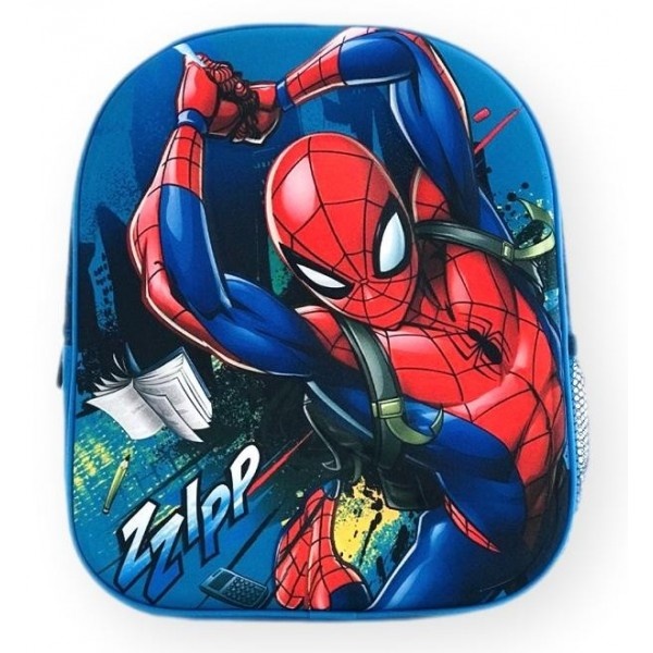 Ghiozdan 3D Spider Man cu 1 compartiment mare prevazut cu fermoar, 1 buzunar lateral, bretele buretate si reglabile. Fermoarul este accesorizat cu personajele in miniatura.