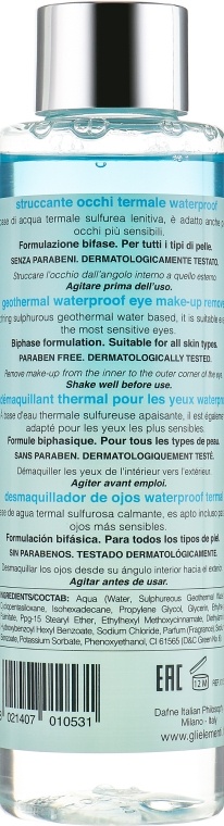 Un demachiant pentru ochi cu două faze pe bază de apă geotermală sulfuroasă, care îndepărtează toxinele și calmează, nu conține ingrediente agresive de curățare, datorită glicerinei vegetale, conferă o senzație de confort pe termen lung.