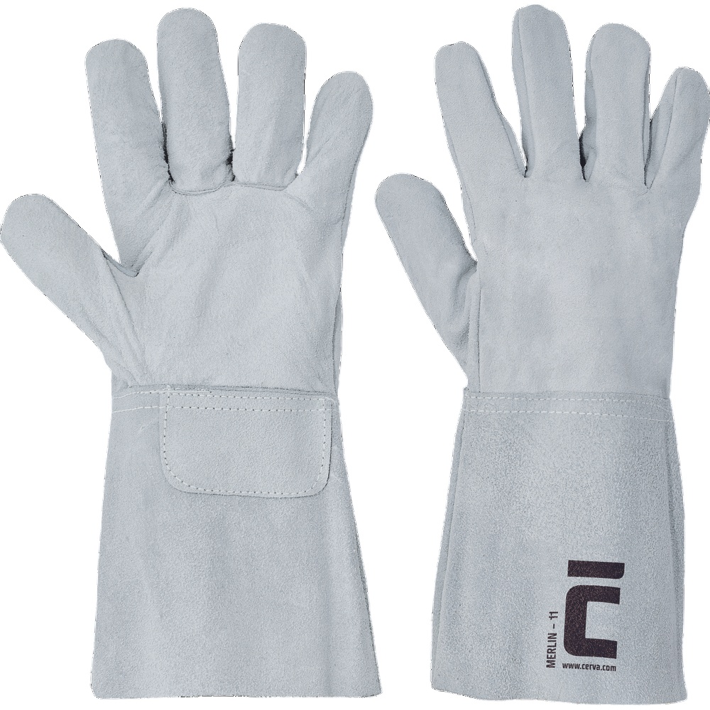 Mănușile Cerva Merlin 11 sunt confecționate integral din piele spalt de bovină, având manșeta tip gauntlet de 15 cm, fără căptușeală. Certificat pentru lucrări de sudură, tip B (variantă W – manșetă mai lată). Lungimea mănușilor este de 35 cm, lungimea manșetei — 15 cm. Respectă standardele EN ISO 21420, EN 12477 (Type B), EN 388 (2123X) și EN 407 (41XX3X). Aceste mănuși sunt potrivite pentru construcții, industrie grea, minerit și cariere, industria auto și inginerie, oferind protecție sigură, confort și durabilitate în condiții de lucru dificile.
