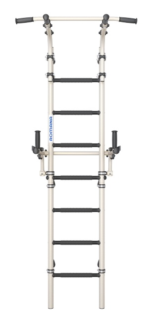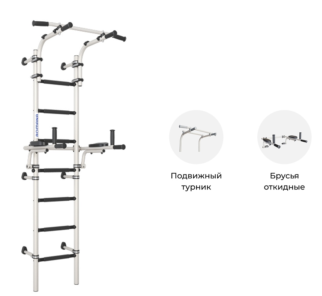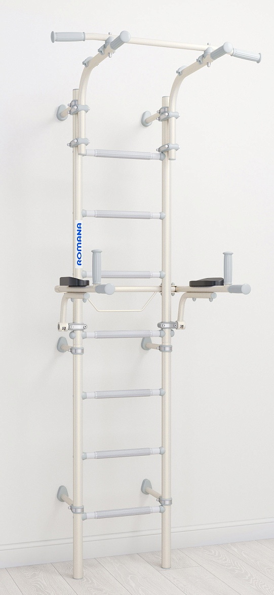 ROMANA S10 este un complex de sporturi acasa pentru intreaga familie, atat copiii cat si adultii se pot antrena pe el. Este destul de compact si nu ocupa mult spatiu: latimea treptelor este de 410 mm, aceasta este cea mai optima dimensiune pentru antrenament pe barele denivelate care vin cu trusa. Barele sunt pliabile, iar după cursuri pot fi mutate în poziție verticală. Bara orizontală poate fi mutată în înălțime și asigurată în mod convenabil pentru utilizator, folosind cleme moderne de încredere. Complexul sportiv este fixat de perete, clemele pot fi deplasate vertical pentru a evita intrarea în cabluri sau cavități.