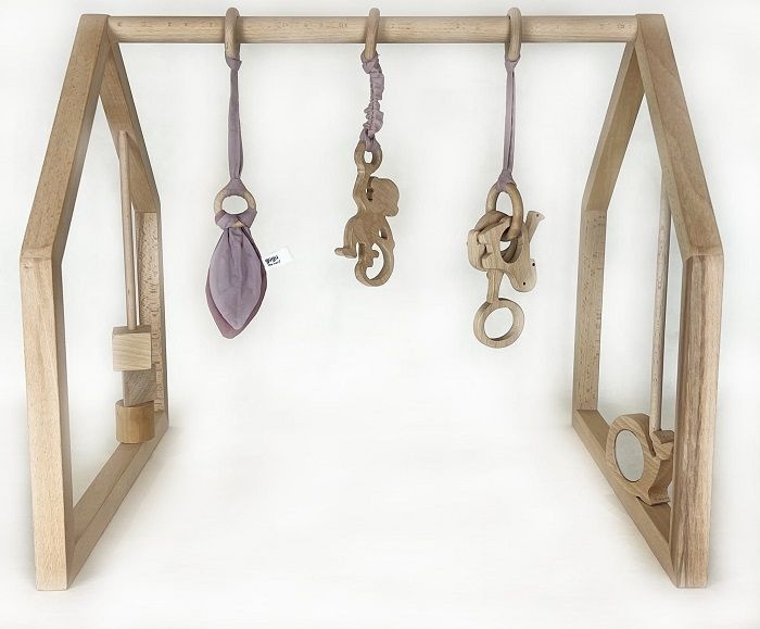 Un suport natural de sală de gimnastică pentru bebeluși, inspirat de Montessori. Simplu, dar bogat în opțiuni distractive. Sprijină dezvoltarea abilităților motorii, coordonarea ochi-mână, stimulează simțurile. Fabricat din lemn de fag și bumbac. Umerașele pot fi îndepărtate pentru spălare fără a demonta suportul.