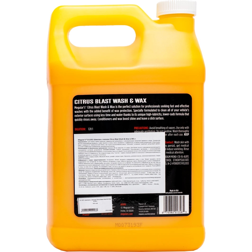 Citrus Blast Wash & Wax – soluția ideală pentru profesioniști care caută un detergent eficient cu conținut de ceară. Produsul este conceput pentru spălarea oricăror suprafețe exterioare ale automobilului cu un consum minim de timp și apă. Formula unică, cu un grad ridicat de lubrifiere, face spumă puțin și se clătește foarte ușor de pe suprafață, lăsând caroseria îngrijită și strălucitoare.