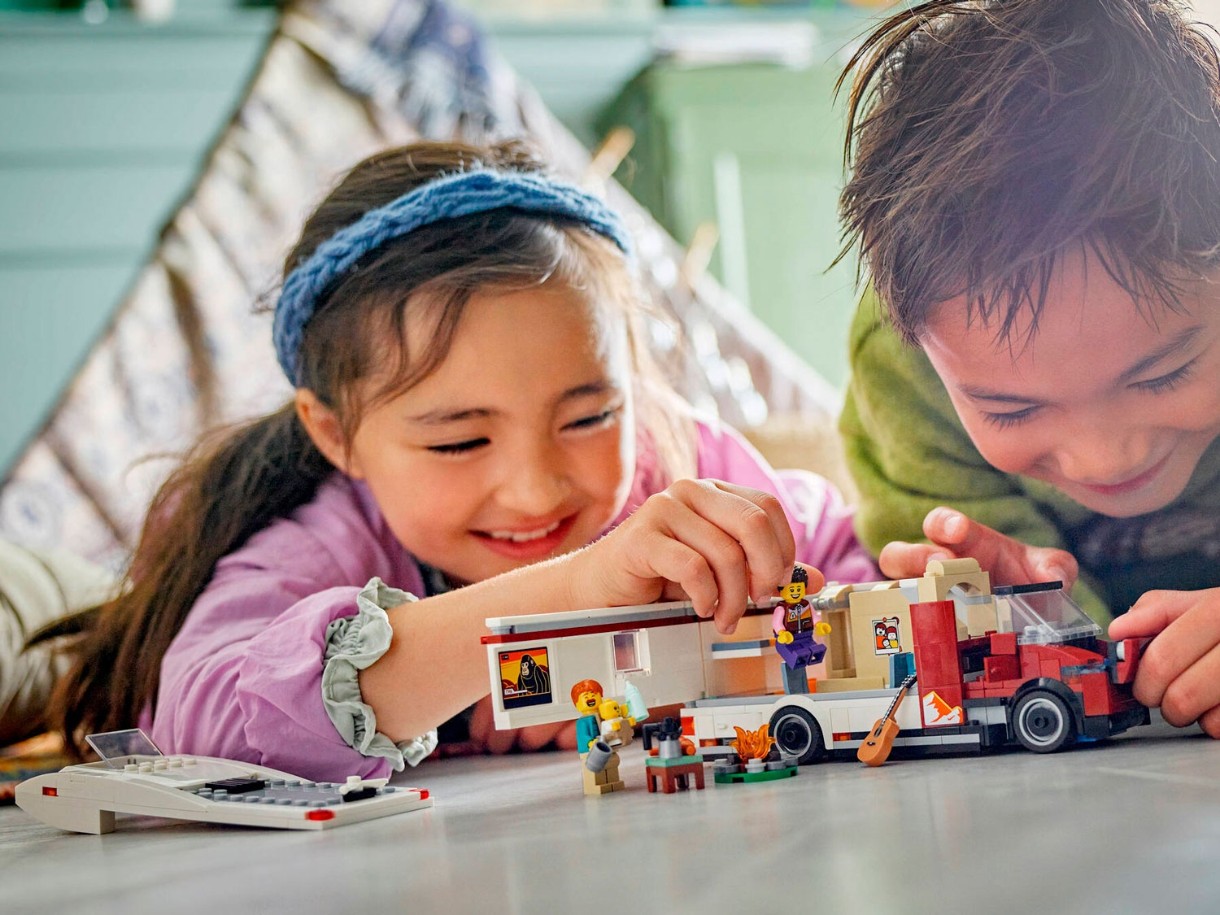 Cu jucăria LEGO® City Rulotă de Aventură de Vacanță (60454), copiii pot călători oriunde îi duce imaginația. Acest set distractiv pentru vârste de 6 ani și peste este plin de caracteristici realiste, inclusiv un spațiu de locuit modern cu bucătărie, toaletă, paturi suprapuse și un pătuț. Setul include, de asemenea, o masă și 2 scaune pentru utilizare în interior și exterior, plus o chitară de jucărie și un foc de tabără. Pur și simplu adăugați minifigurinele mama, tata și micuțul lor pentru jocuri imaginative și povești.