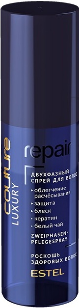 Un spray de păr în două faze de la marca Estel Professional este realizat special pentru refacerea eficientă a buclelor deteriorate prin utilizarea regulată a dispozitivelor termice, vizite frecvente la un colorist. Componentele active ale Couture Luxury Repair Haute pătrund în structura buclelor, umplându-le delicat «golurile», umplând firele cu rezistență, fermitate și elasticitate. În plus față de îndeplinirea excelentă a principalelor sale atribuții, remediul universal se distinge și prin funcții de protecție de înaltă calitate — minimizează efectele negative ale mediului, prevenind formarea de radicali liberi și imperfecțiuni minore.