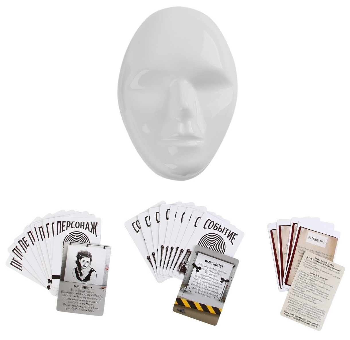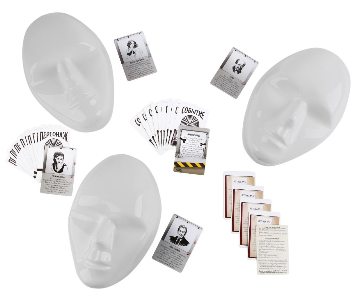 In set26 de cărți de caractere, 10 carduri de eveniment, 5 scenarii pentru prezentator, 10 măști, regulile jocului