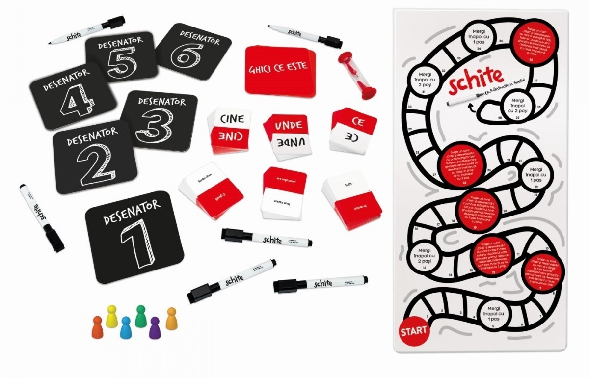 In set1 placa, 6 file de schite, 6 file Guess it, 150 de carti cu 300 de teme, 1 clepsidra, 6 piese, Brosura de instructiuni