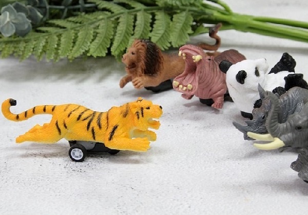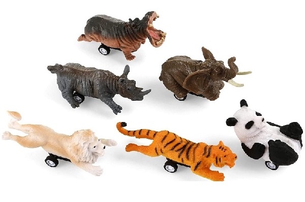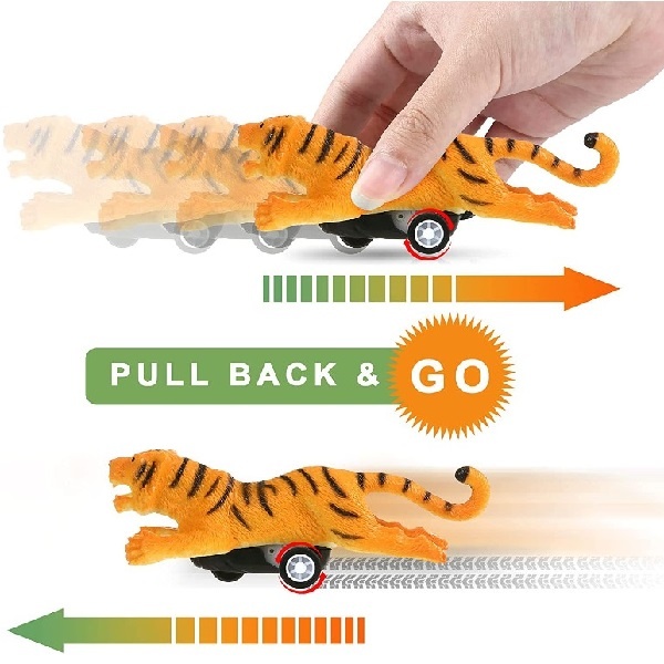 Fiecare animal are dimensiunea 10 cm și mecanism cu inerție, cu tragere înapoi.