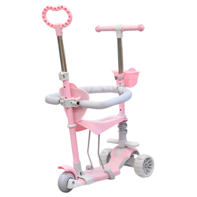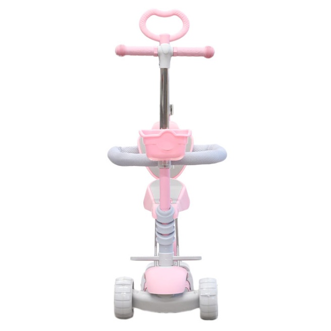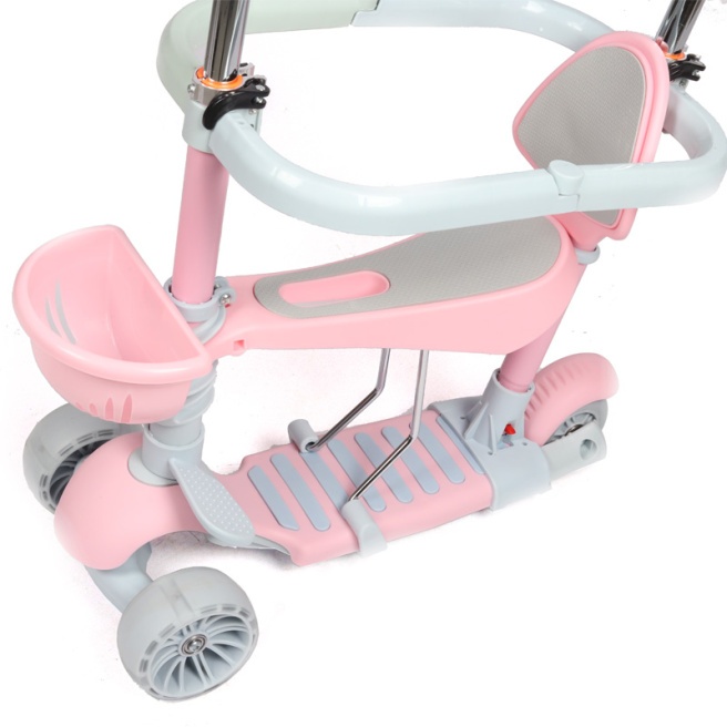 Roțile din față ale scuterului sunt iluminate, realizate din clorură de polivinil. Este fixat ferm de cadrul scuterului, folosindu-l, copilul poate folosi scuterul ca bicicletă de echilibru.