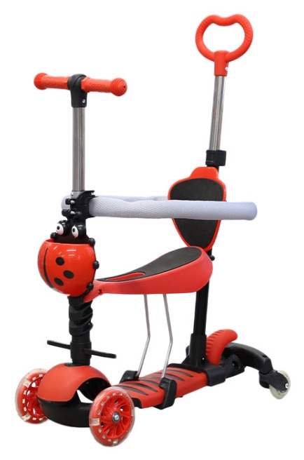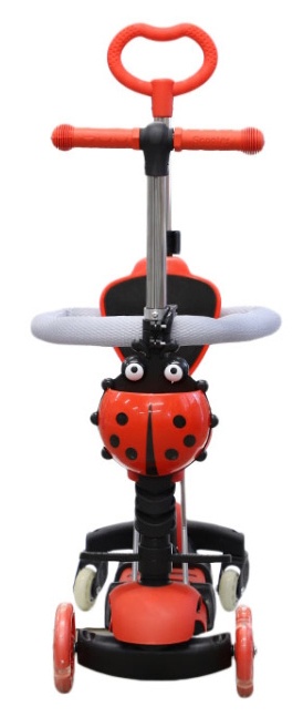 Trotinetă pentru copii cu trei roți 5 in 1 Buburuză cu mâner pentru părinți. Setul include un scaun detașabil, un spătar cu braț, un suport pentru picioare și un coș în formă de buburuză, care este atașat de volan. Roțile din față strălucesc în timp ce se rotesc.
