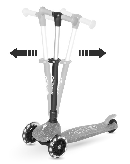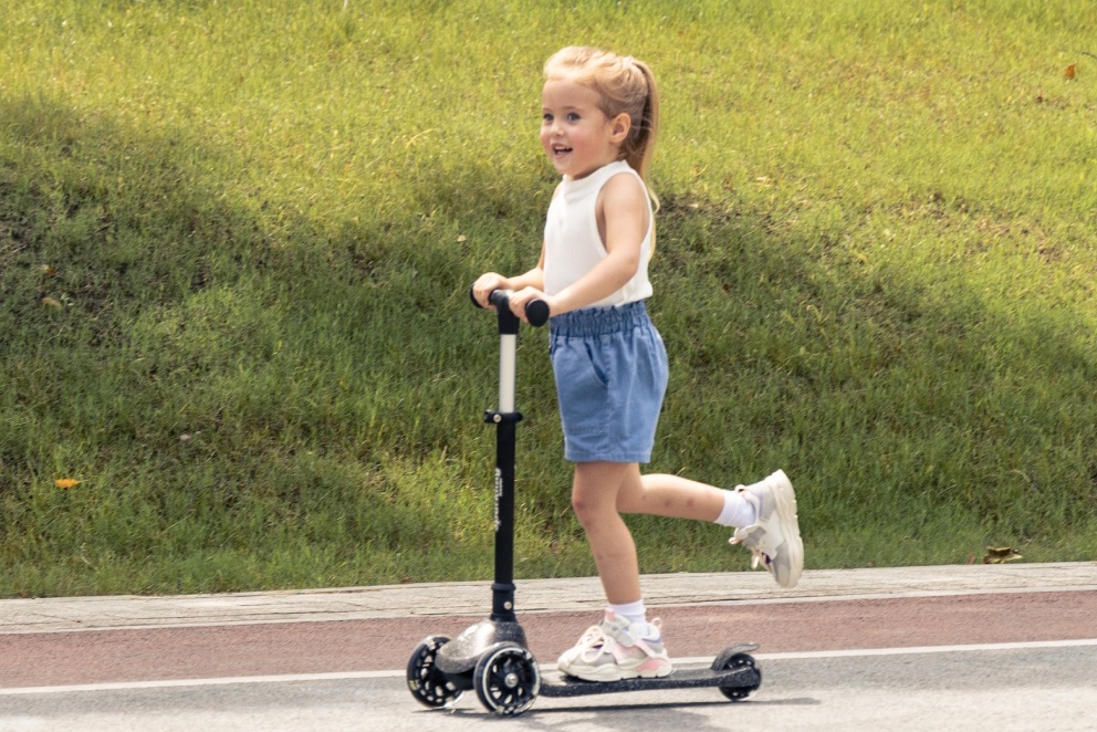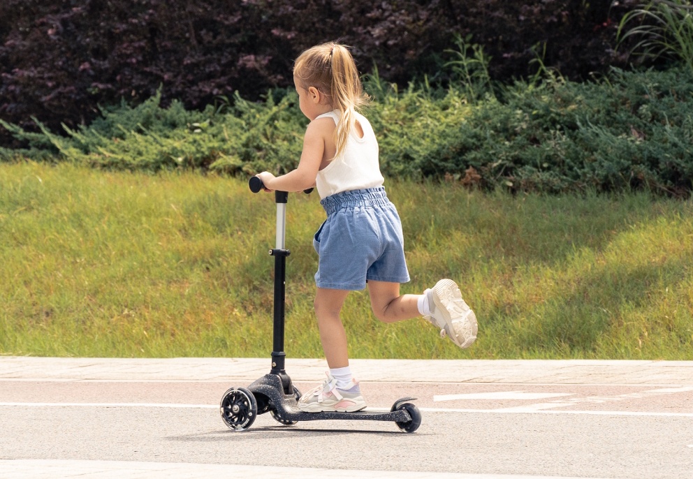 Designul cu trei roți oferă o stabilitate excelentă, iar sistemul de înclinare ajută copilul să dezvolte echilibrul, coordonarea și încrederea în mișcări. Roțile luminoase din poliuretan cu lumini LED se aprind în timpul mersului fără baterii, făcând fiecare plimbare și mai luminoasă și mai vizibilă.