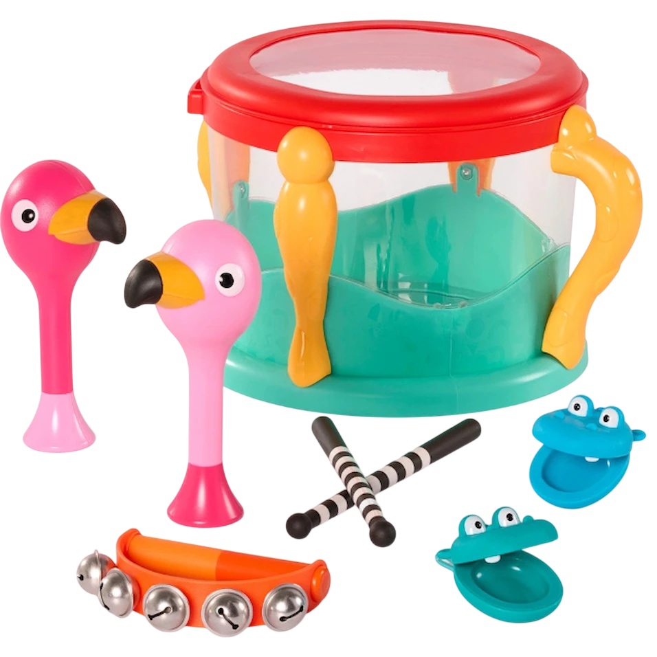 Începeți să vă jucați cu setul Battat Animal Jamboree! Jucați-vă cu maracasurile în formă de flamingo, agitați clopoțelul, gâdilați hipopotamii sau bateți la tobe! Cu acest set portabil puteți face atât de multe descoperiri muzicale!