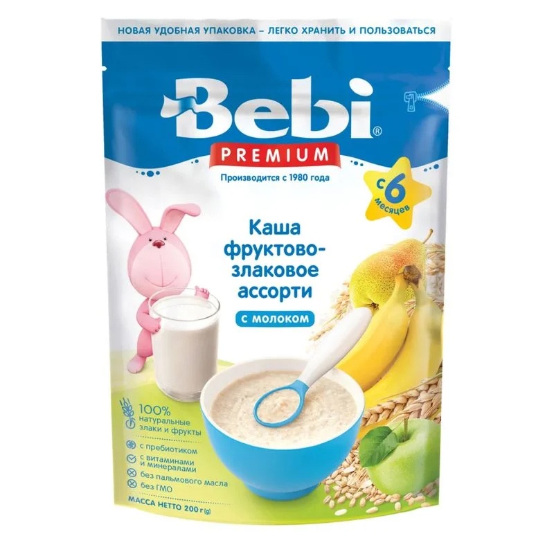Terci de lapte Bebi Premium asorti de fructe și cereale este un amestec echilibrat de cereale care va oferi bebelușului o saturație pe termen lung. Produsul conține orez, bogat în aminoacizi și potasiu, precum și grâu, o sursă de carbohidrați ușor digerabili. Suplimentele din pere, banane și mere oferă micronutrienți importanți, precum și fibre alimentare care îmbunătățesc funcția intestinală.