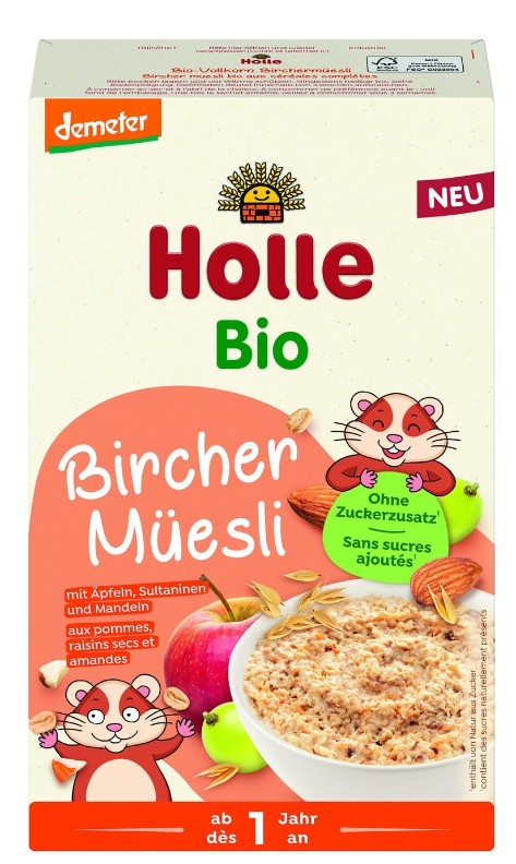 Müsli bio Holle Bircher cu ovăz integral, fructe și migdale – de la 12 luni – un mic dejun delicios și echilibrat, special creat pentru a sprijini dezvoltarea armonioasă a celor mici, cu ingrediente 100% organice și 82% biodinamice.