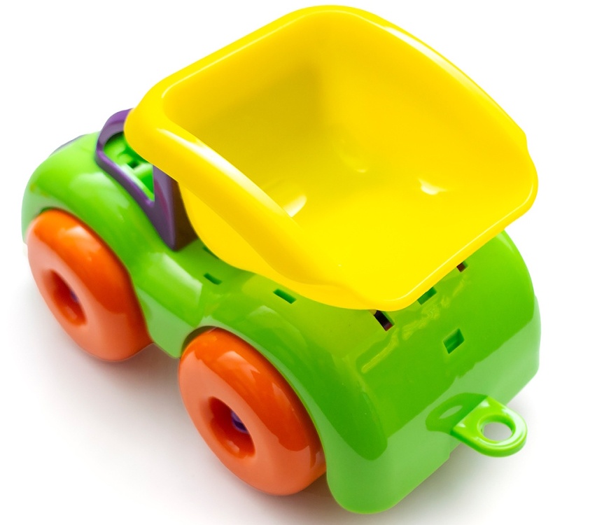 Setul de nisip include o mașină, trei matrițe și o lingură.