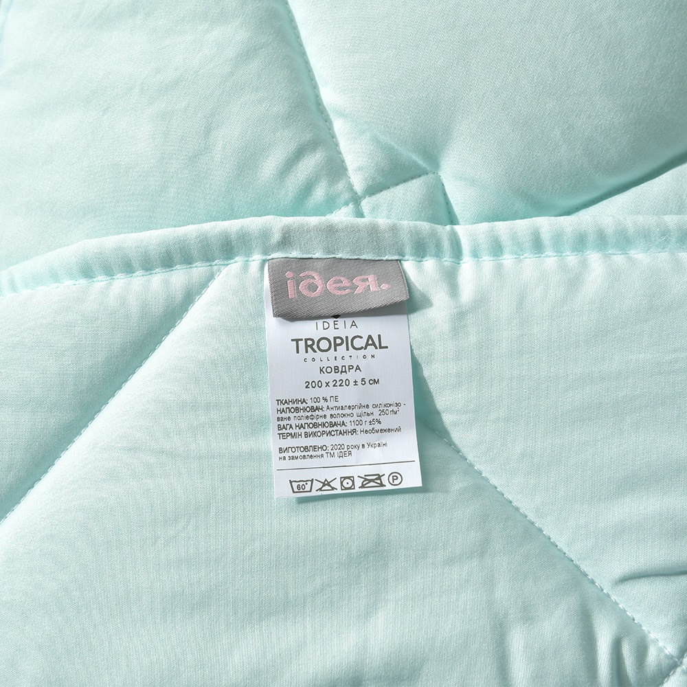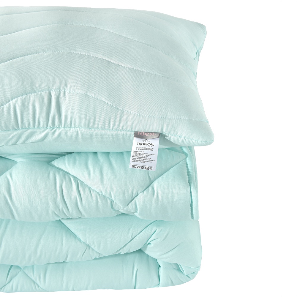 Setul TROPICAL conține o pernă și o plapumă. Disponibil în 2 culori: mentă și pudră.