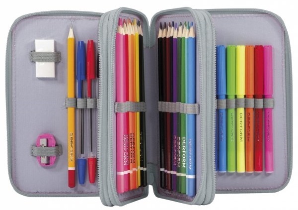 Echipamentul include: radieră, ascuțitoare, 2 pixuri, creion, riglă, plan de lecție, 18 creioane, 18 markere.