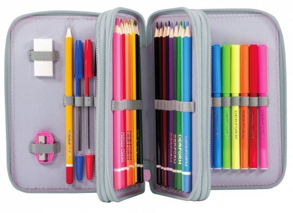 Echipamentul include: radieră, ascuțitoare, 2 pixuri, creion, riglă, plan de lecție, 18 creioane, 18 markere.