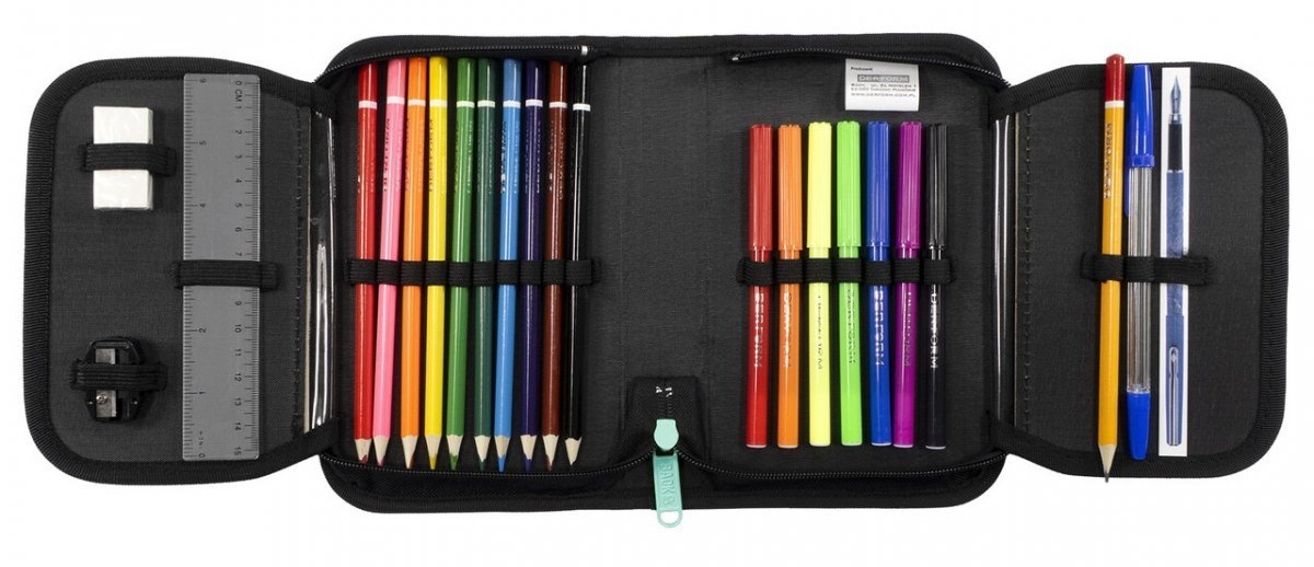 Cutia de creioane cu un singur compartiment BackUP cu accesorii include: 10 creioane creionate, 7 markere, un stilou, un creion, un ascuțitor, o radieră și o riglă. Bucle de centură care asigură depozitare sigură și convenabilă. În interior, există două clape cu buzunare transparente care conțin un plan de lecție și o masă de înmulțire. Un compartiment prins cu fermoar. O structură bună, solidă și rigidă.