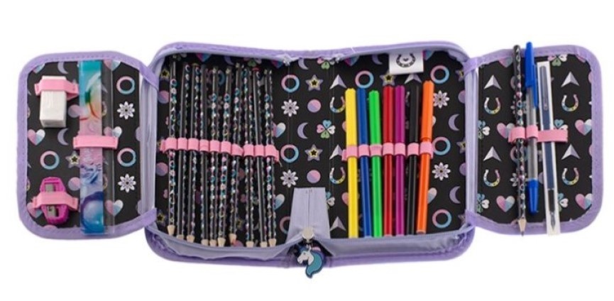 Caracteristicile produsului: - 1 compartiment principal inchis cu fermoar, - doua clape interioare cu inchidere si buzunare transparente, - imprimeu licentiat la exterior si interior si pe elemente ale echipamentului selectate, - iti permite sa pastrezi accesoriile scolare ordonate si bine organizate, - functioneaza excelent atât pentru copiii mai mici, cât și pentru cei mai mari, - în plus, cutia de creion conține o tabelă de înmulțire și un plan de lecție. Echipament pentru toc: - 10 x creioane colorate, - 7 x markere colorate, - 1 x riglă de 15 cm, - 1 x radieră, - 1 x ascuțitoare, - 1 x pix, - 1 x creion.