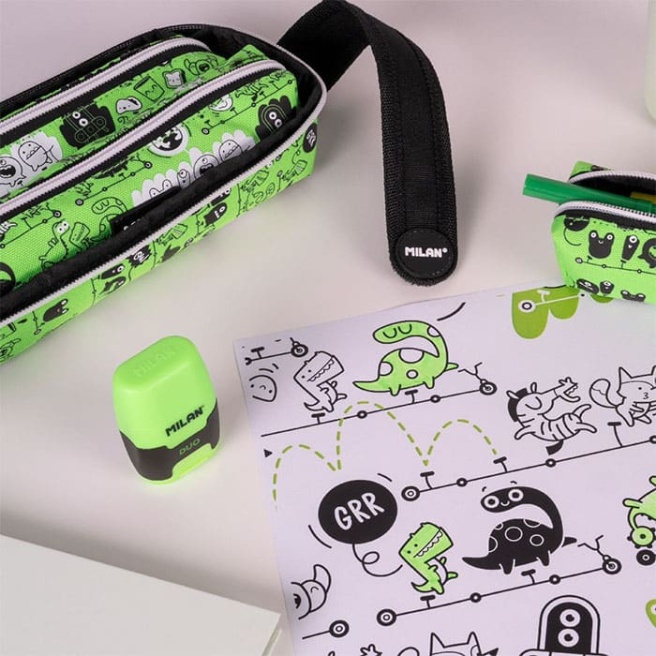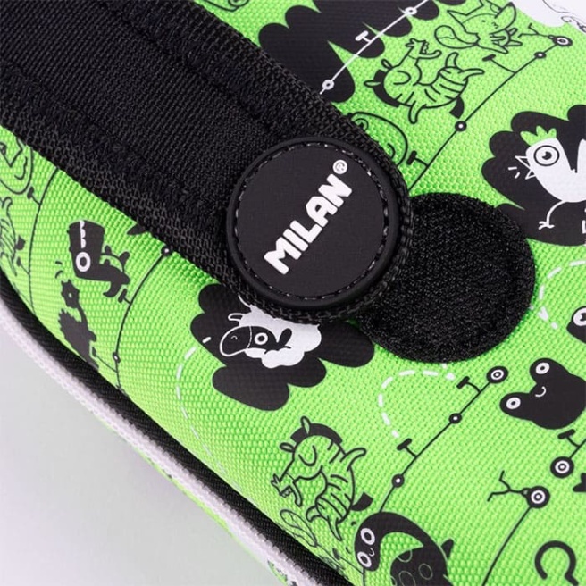 Seria specială Tandem 2 - personaje cu personalități foarte diferite care merg în tandem noaptea. Dinozaurii, crocodilii și extratereștrii merg în tandem, în timp ce prichindeii haioși, ouăle și croissantele fac același lucru. Toate lucrează ca un grup și vâslesc în aceeași direcție. Imprimeuri albe și negre pe un fundal verde. Compoziția țesăturii: poliester. Dimensiuni: 22,5 x 11,5 x 11 cm.