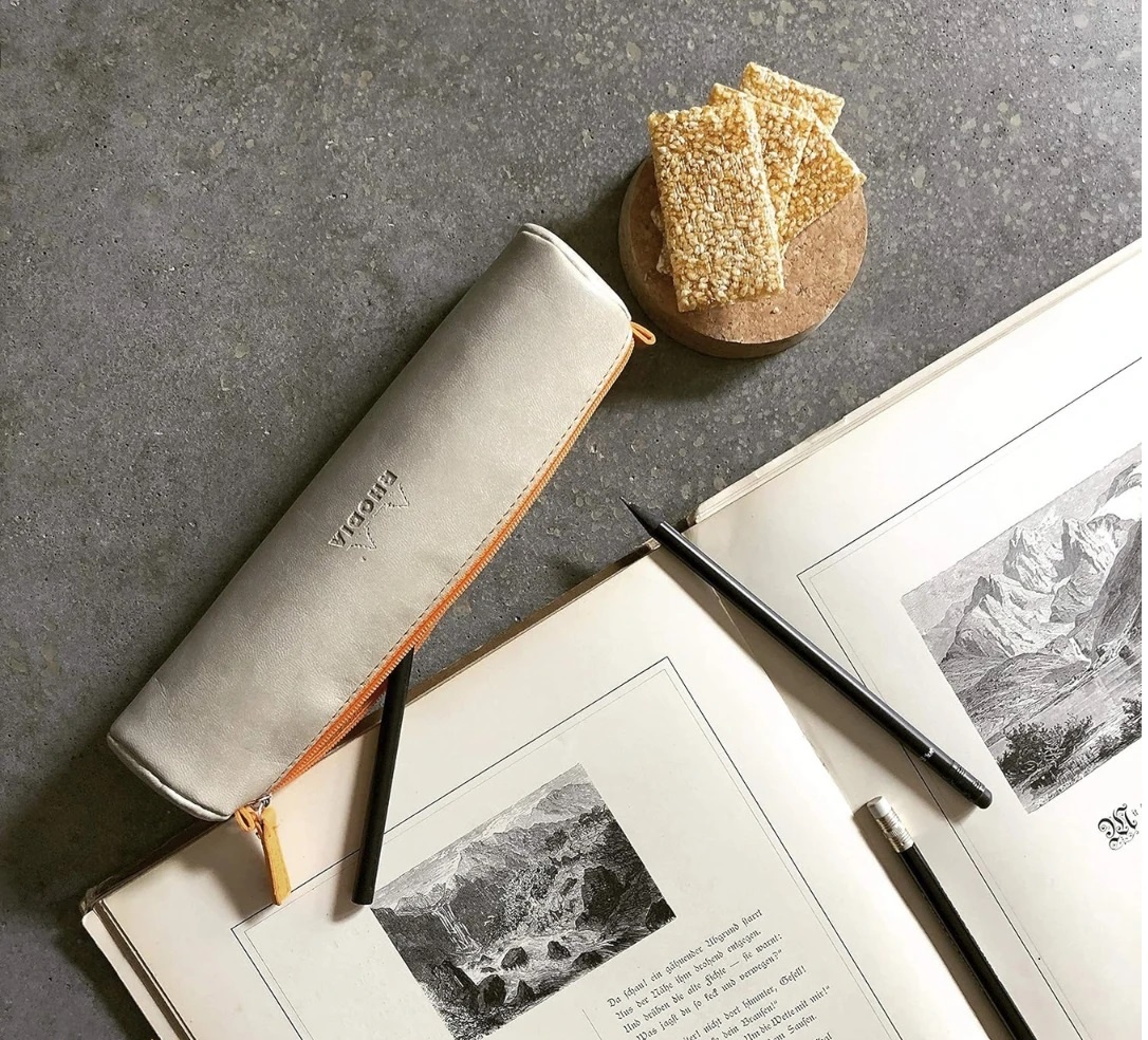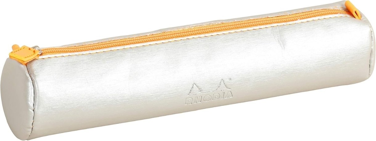 Imitație de piele italiană de înaltă calitate, cu textură catifelată și logo Rhodia embosat. Cusături autentice, fermoar cu fâșie de tragere și căptușeală interioară din jerseu ivoire.