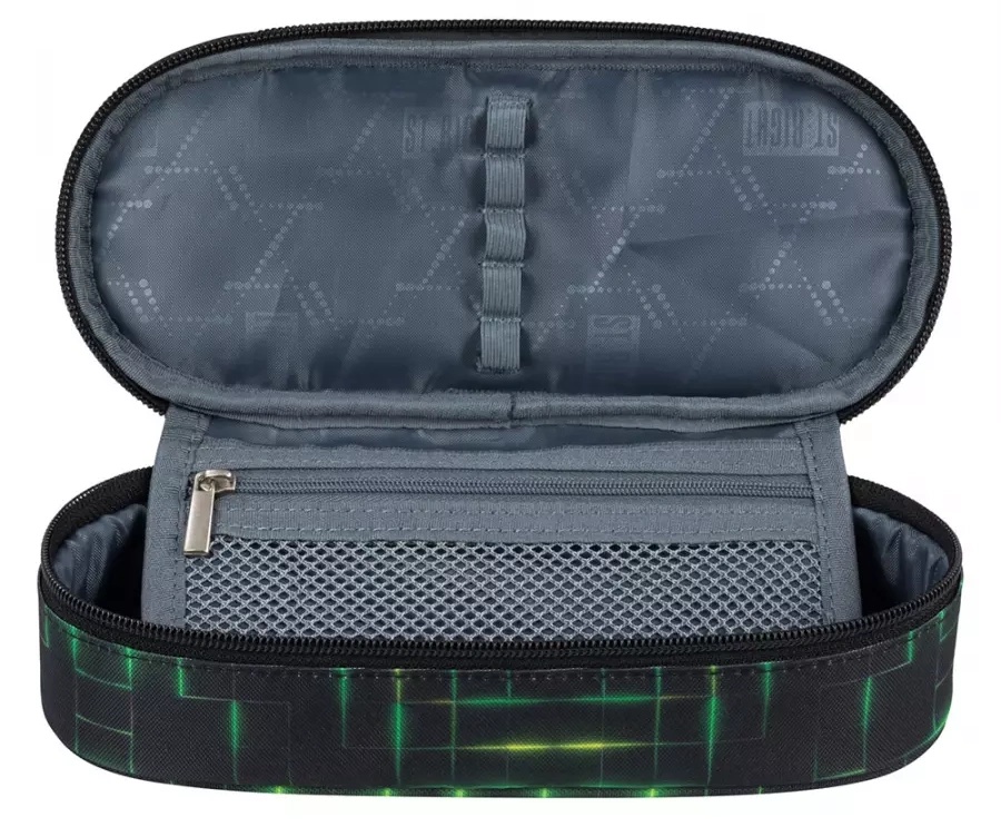 Această trusă practică de penar are o închidere cu fermoar. Husa este întărită. În interior, are o clapă suplimentară cu buzunar cu fermoar. Clapa include și benzi elastice pentru a ține instrumente de scris.