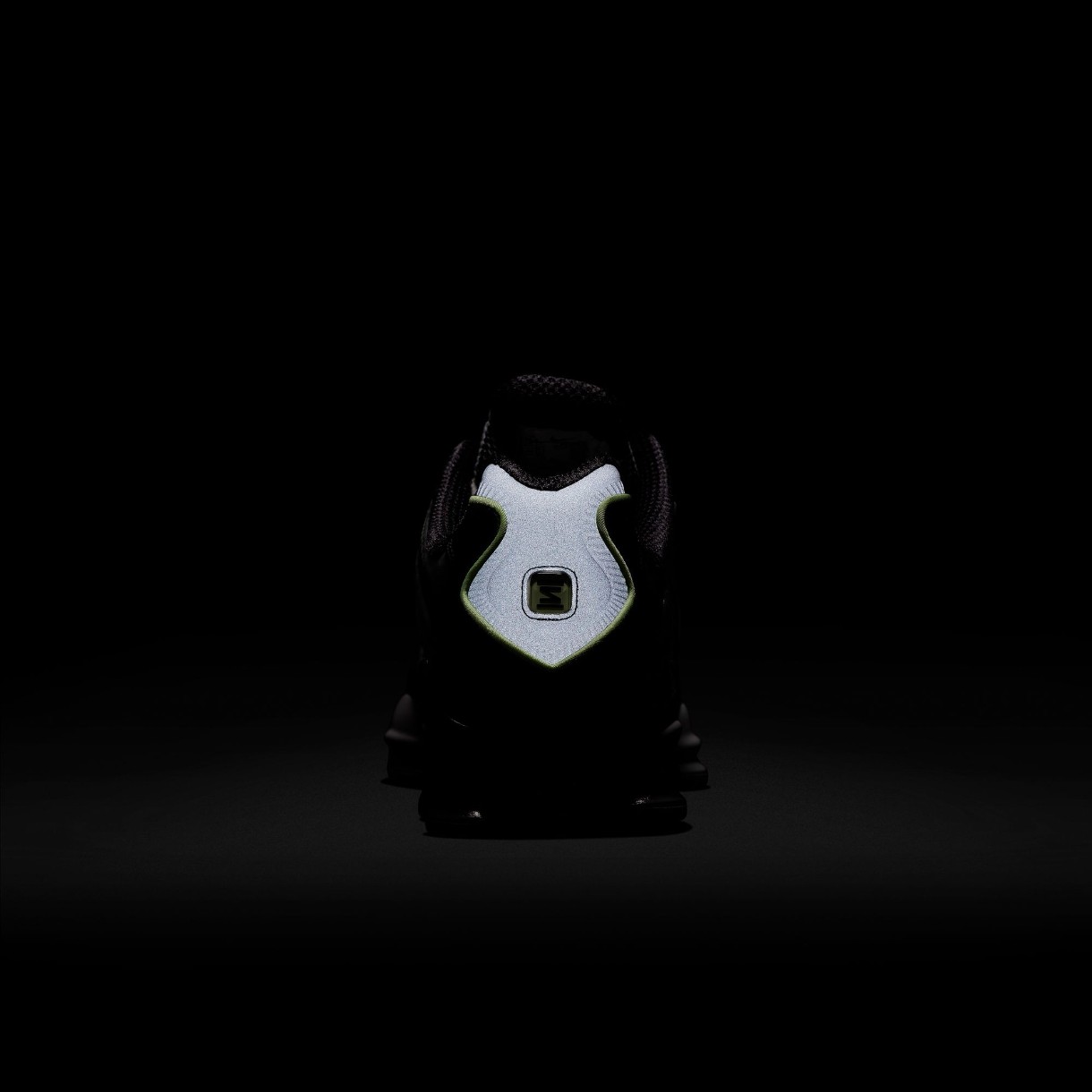 O placă TPU în călcâi, între talpa intermediară și tehnologia Nike Shox, oferă stabilitate laterală și suport.