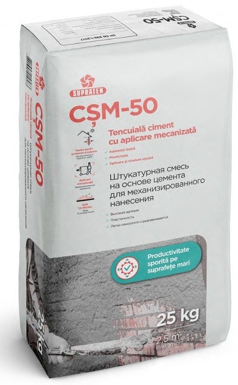 CȘM-50 — amestec de tencuială pentru aplicare mecanizată pe bază de ciment de calitate superioară cu polimeri și plastifianți.