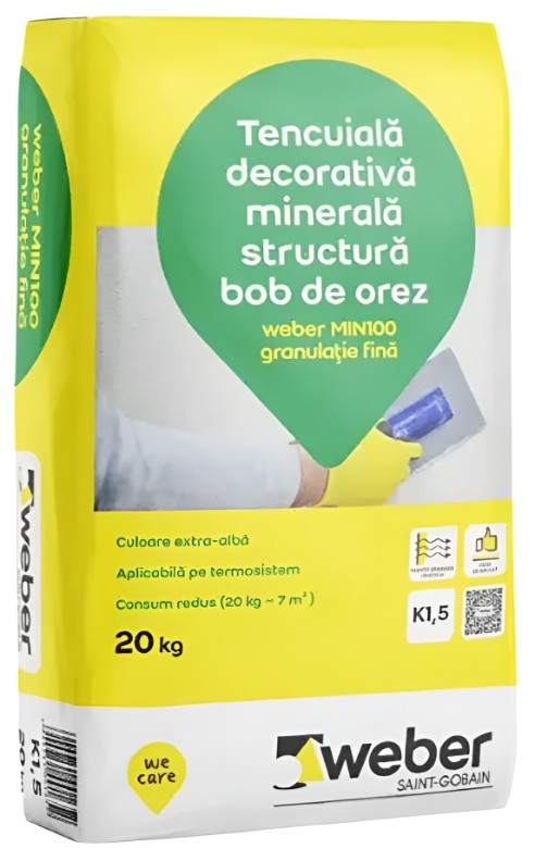 Tencuiala decorativa Weber Min100 20kg - pulbere de culoare albă pe bază de ciment alb, var, adaosuri minerale, bogat în aditivi şi răşini sintetice, hidrofob, cu aderenţă mare la suport. Se recomandă pentru finisarea pereţilor la exterior şi interior. Poate fi utilizată la finisarea sistemelor de izolaţie termică şi de asemenea ca strat final peste tencuială de bază (ciment, var-ciment), beton sau peste tencuieli termoizolatoare netezite cu tinci.