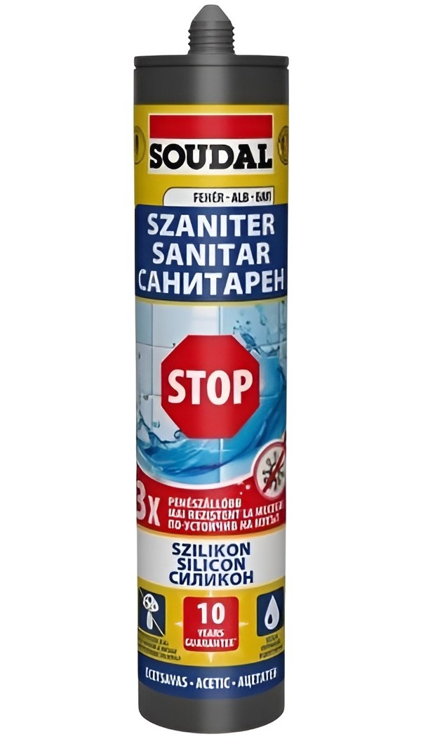 Siliconul sanitar acetat Stop Soudal este conceput pentru etanșarea rosturilor în băi și bucătării. Acest silicon oferă o rezistență la mucegai de trei ori mai mare decât siliconul sanitar standard.