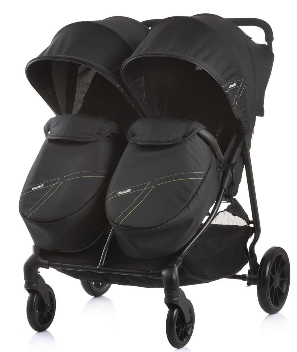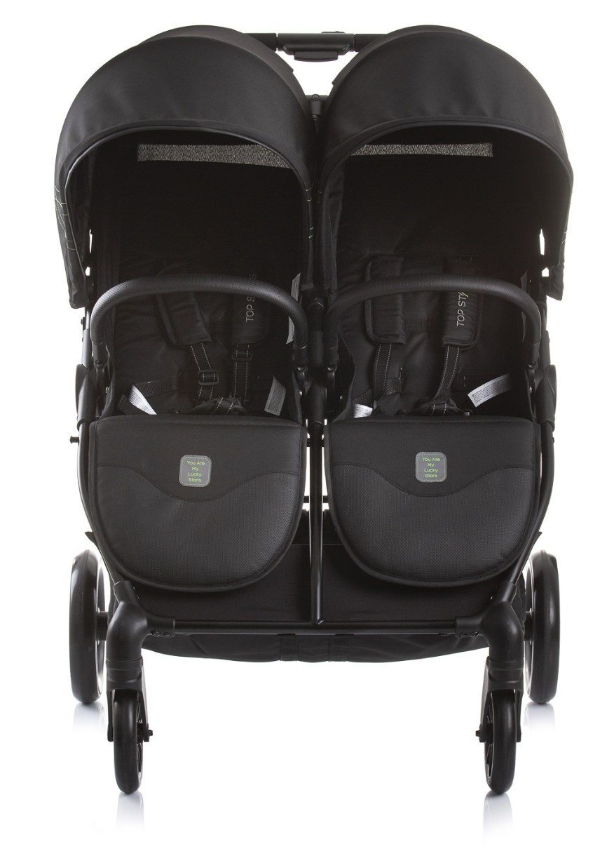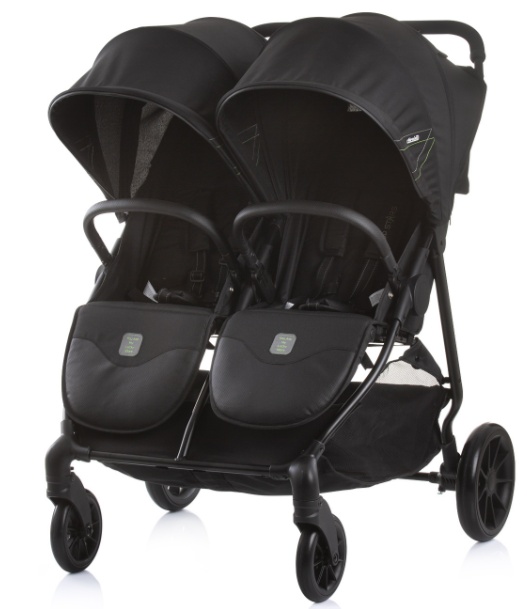 Căruciorul este potrivit pentru nou-născuți și copii cu greutatea de până la 15 kg fiecare. Cadru clasic durabil. Pliere ușoară și compactă cu o singură mână. Spătarul fiecărui scaun este reglabil. Spătar cu mai multe poziții pentru fiecare scaun. Două bare de protecție față detașabile separate, cu tapițerie din piele ecologică. Ham de siguranță în 5 puncte cu perne moi pentru umeri pentru fiecare scaun. Două copertine mari reglabile cu o secțiune suplimentară, suporturi pentru picioare reglabile. Mâner confortabil, acoperit cu material de înaltă calitate. Două coșuri de depozitare separate. Toate roțile se pliază rapid. Toate roțile au suspensie. Roți spate cu frână cu pârghie. Două huse moi pentru picioare. Geantă de accesorii Mama - buzunare convenabile și o saltea de schimbat. Căruciorul este fabricat în conformitate cu standardul european EN1888-1.