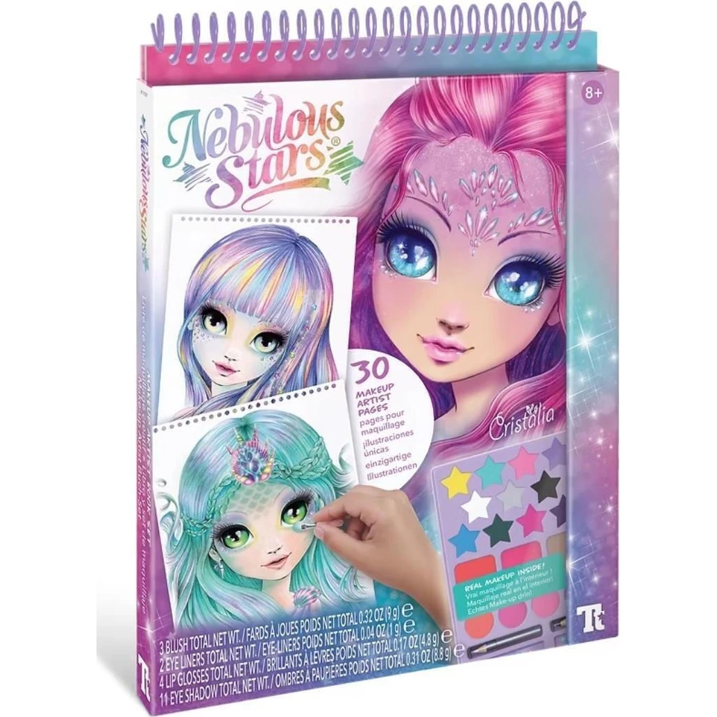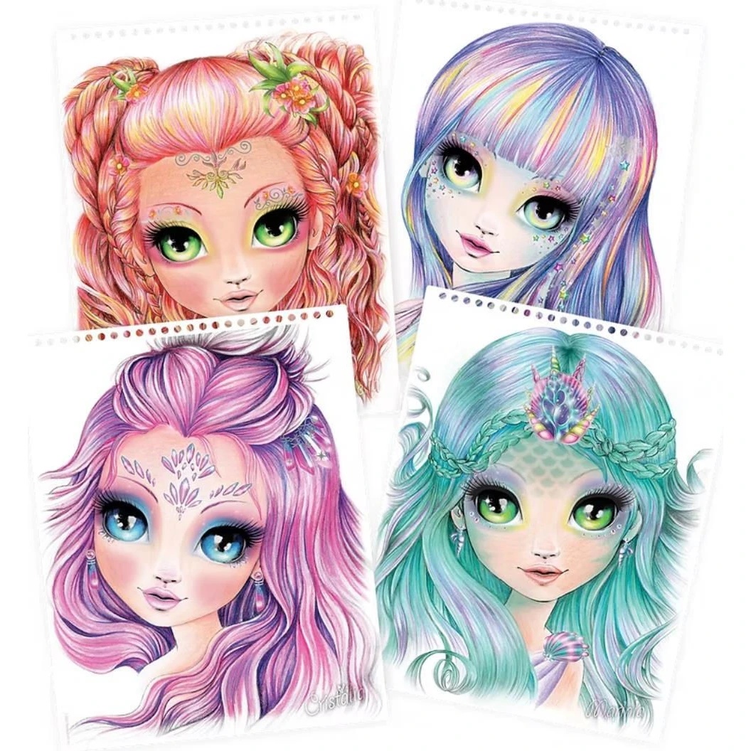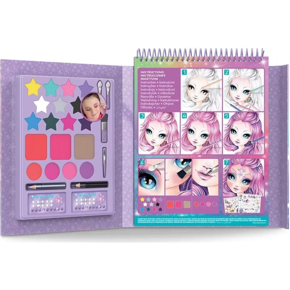 30 de pagini de schițe, 165 de autocolante, 60 de șabloane, set cosmetic din 20 de piese, 4 aplicatoare cosmetice, autocolante cu pietre prețioase pentru corp, 10 tehnici de machiaj