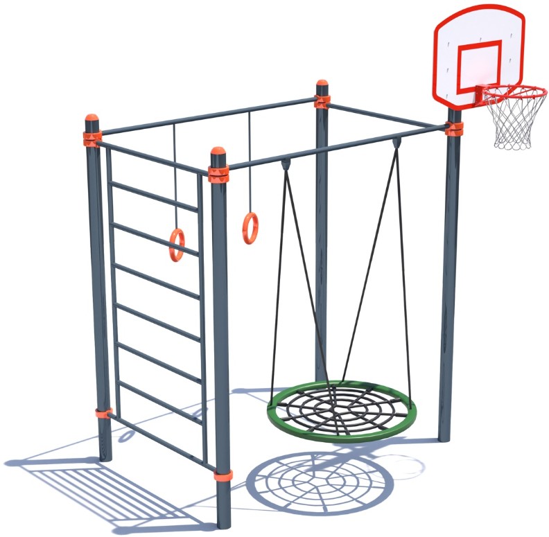 Intră în set: 3 bare orizontale pe mai multe niveluri, scară suedeză, inele de gimnastică, leagăne, panou de baschet cu inel.