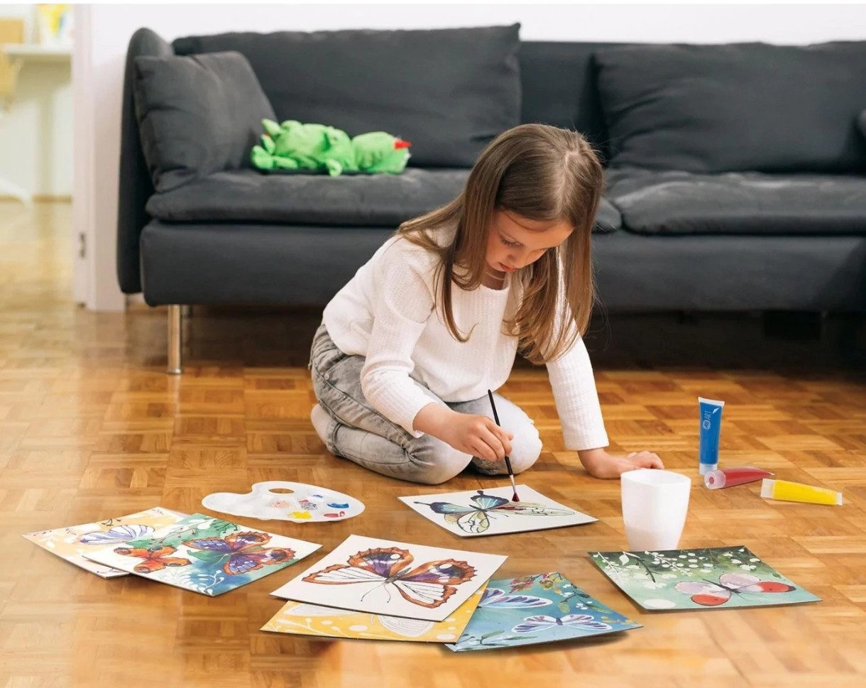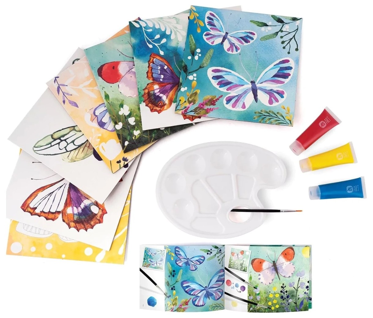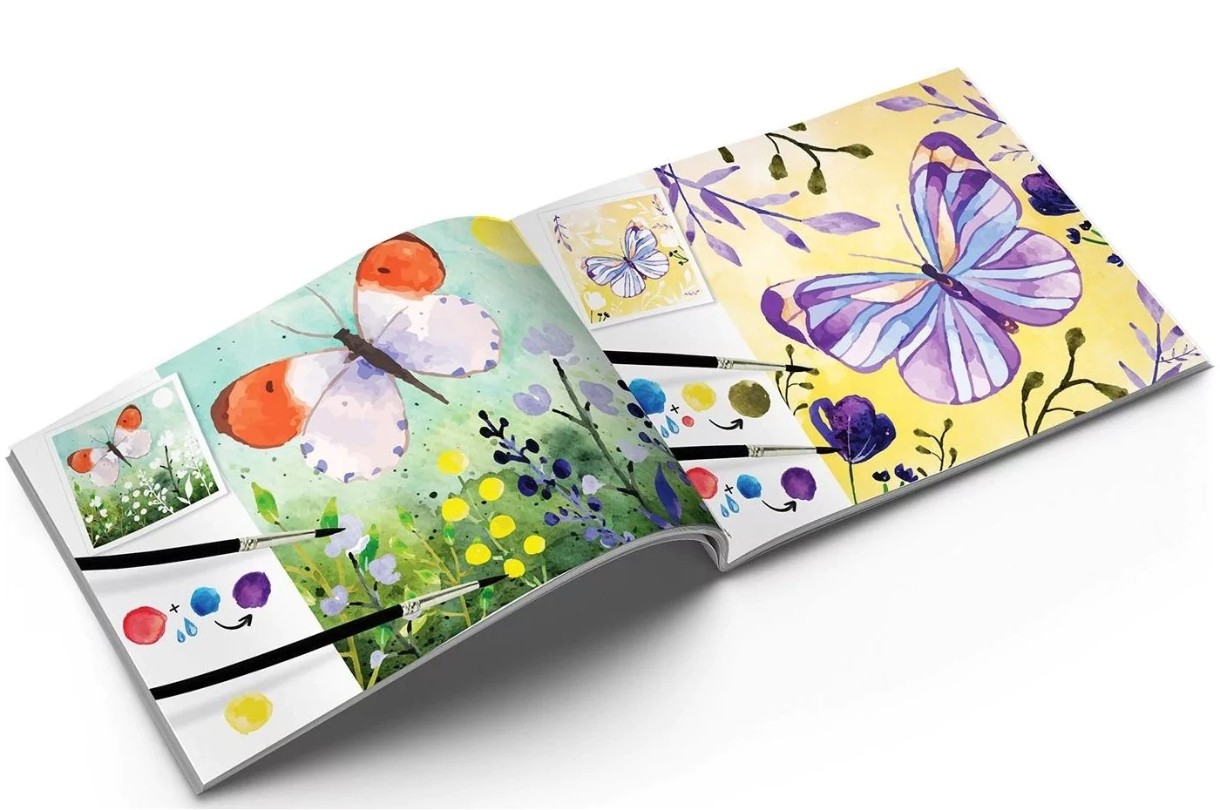 Coloreaza desenele cu acuarele si creeaza opere de arta unice. Contine sabloane cu fluturi 2 sabloane semi-colorate, 5 sabloane albe, 3 culori de acuarela, 1 paleta, 1 pensula si un ghid detaliat pentru a va ghida in procesul de colorare a desenelor.