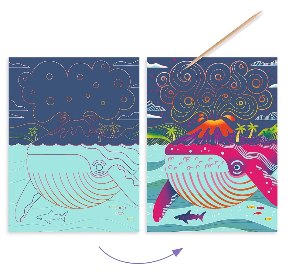 In set4 carduri răzuibile, 1 stilou din lemn cu două fețe, 1 broșură cu explicații color pas cu pas
