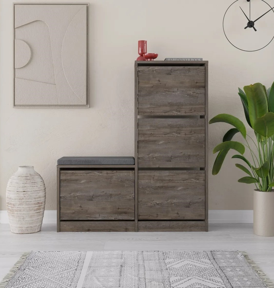 Cu dimensiunile de 105 cm lățime, 118,5 cm înălțime și 26 cm adâncime, dulapul oferă spațiu generos pentru toate perechile de pantofi. Designul inteligent include mai multe rafturi și compartimente, permițând organizarea ordonată a încălțămintei și acces facil la fiecare pereche. Găsirea pantofilor potriviți devine rapidă și ușoară.