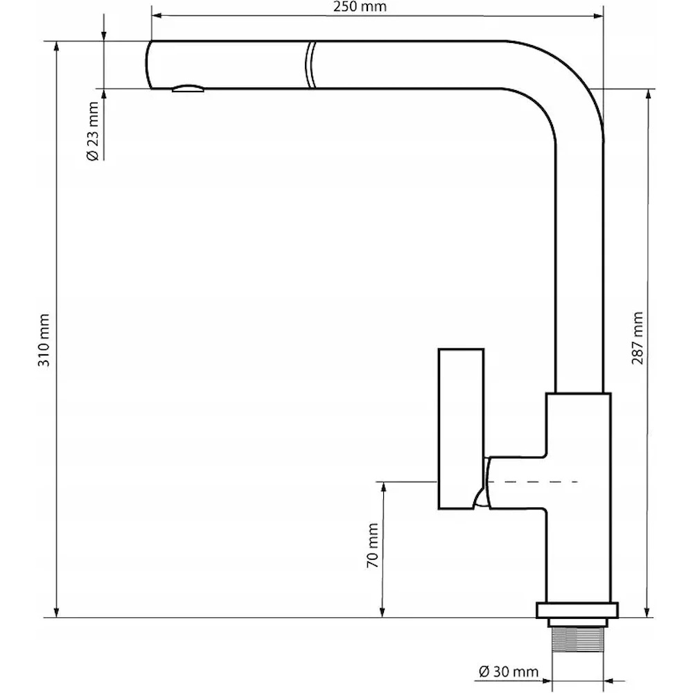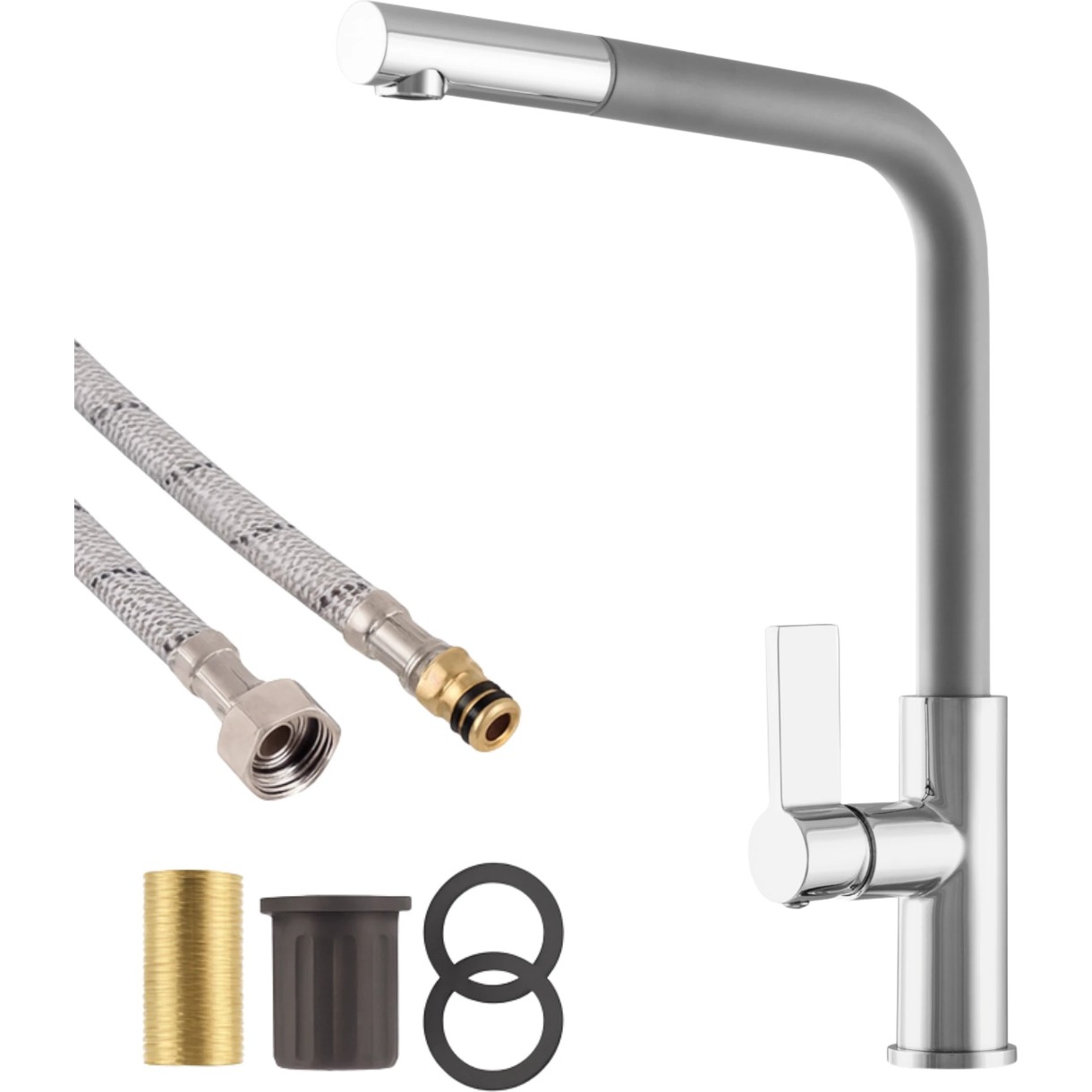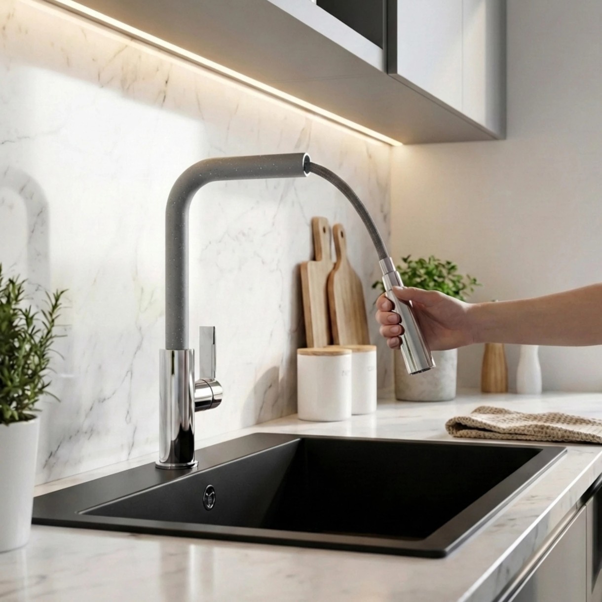 Bateria de bucătărie Granitan LINEA este un robinet modern și funcțional, perfect pentru orice bucătărie contemporană. Are un corp robust din alamă, care asigură durabilitate și fiabilitate în utilizare. Bateria este dotată cu un căștig extractabil și un gât pivotant la 360°, oferind libertate maximă pentru a direcționa fluxul de apă în orice punct al chiuvetei — ideal pentru spălarea vaselor sau umplerea recipientelor.