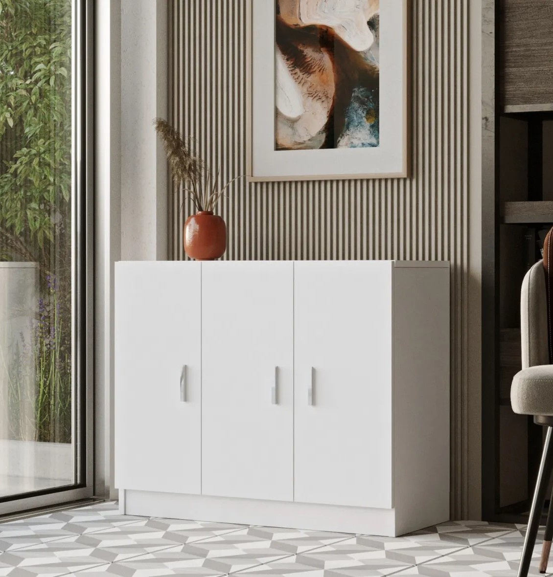 Cu biroul și masa sa spațioasă, veți avea suficient loc pentru a lucra și a vă organiza lucrurile esențiale. Sertarul oferă un spațiu convenabil pentru dosare și papetărie, în timp ce raftul permite expunerea elegantă a cărților și obiectelor decorative. Dulapul și bufetul lateral oferă spațiu suplimentar de depozitare, menținând biroul organizat, iar consola adaugă funcționalitate și stil spațiului de lucru.