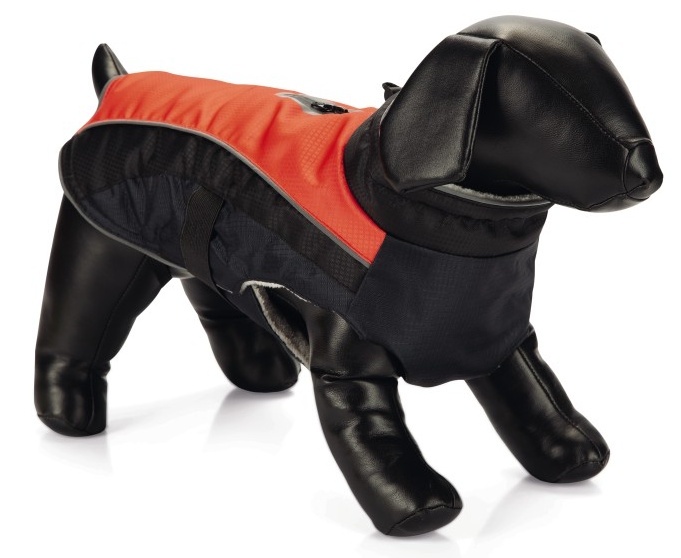 Geaca este confecționată din material rezistent la apă. Este dotată cu o bandă reflectoare, iar pe spate este prevăzută cu un fermoar pentru lesă care se agață de guler sau ham. Geaca este prevăzută cu o căptușeală moale în interior și elastice reglabile pentru picioarele din spate.