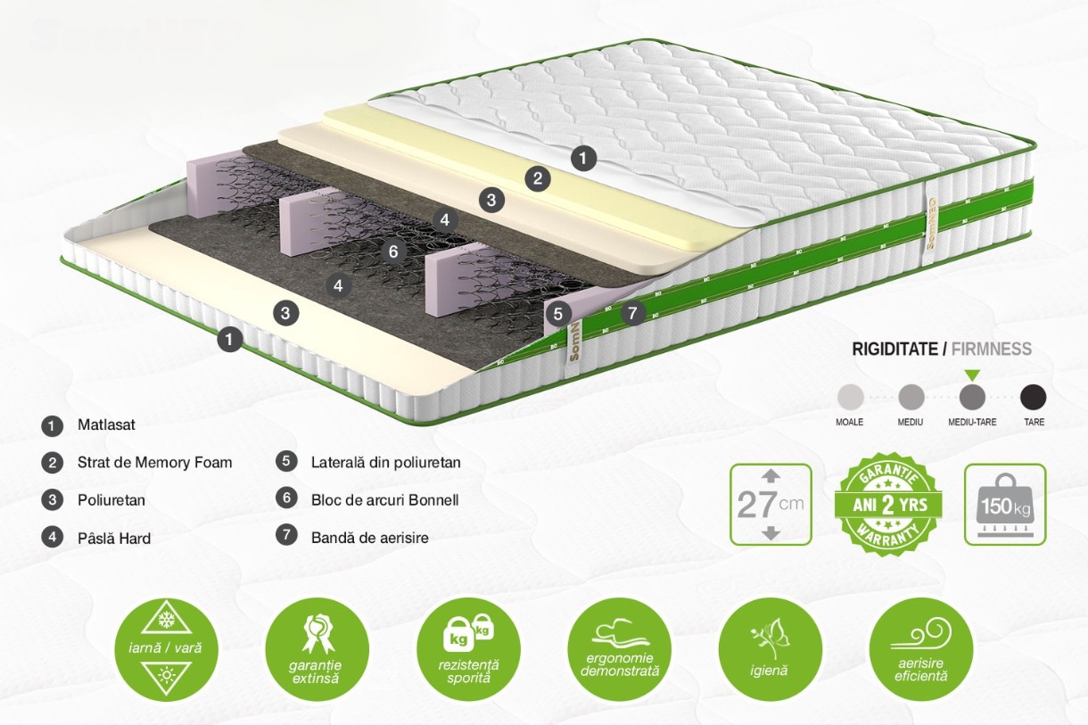 3. Memory Foam — material cu un grad inalt de elasticitate, cu efect de memorie a formei. Ofera patului moliciune suplimentara, ajuta corpul sa se relaxeze in timpul somnului.