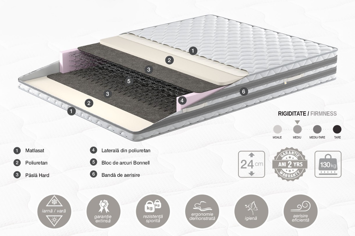 Salteaua Duo - o îmbinare perfectă a proprietăţilor de confort sporit cu cele de accesibilitate financiară. Dotată cu sistem de Iarna/Vara care permite alegerea nivelului de confort: fata de iarna, datorită unui strat de poliuretan mai dens oferă o susţinere mai bună, dar şi un grad mai înalt de păstrare a căldurii, comparativ cu fata de vara, care este mai poroasă, dar mai rigidă. Salteaua respiră prin 2 benzi de aerisire dispuse lateral şi este acoperită cu o husă din tesatura de tip Knitted, plăcută la atingere.