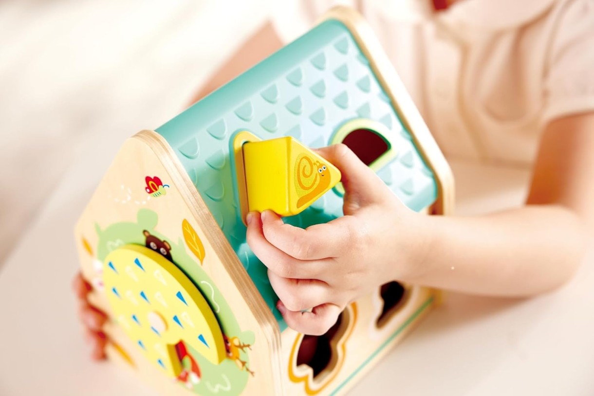 - Mod de joacă 2-în-1: Jucăria poate fi folosită ca sortator de forme sau ca „căsuță de păpuși”, unde personajele animale pot locui și se pot juca.