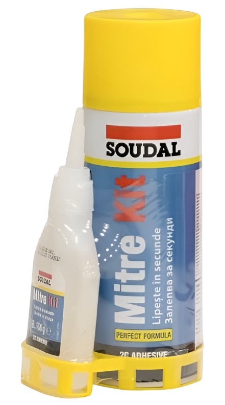 Adezivul instant bicomponent Mitre Kit Soudal este format din două componente: un superglue pe bază de cianoacrilat și un activator aerosol. Adezivul are acțiune rapidă și se întărește aproape instantaneu.