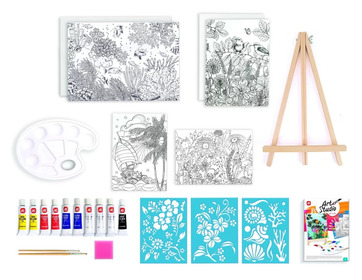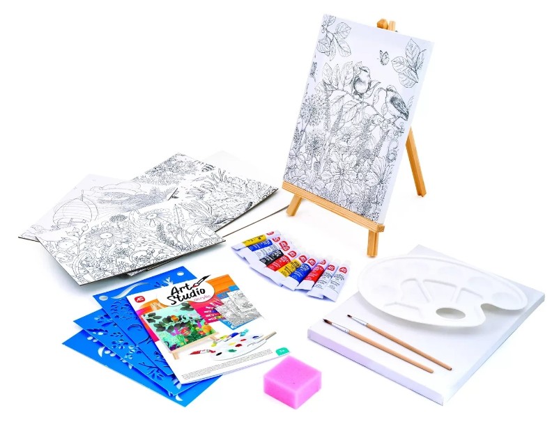 In set1 șevalet din lemn, 1 paletă, șabloane, 2 pensule, 10 vopsele acrilice, accesorii pentru design, vopsele acrilice, ghid de pictură ilustrat